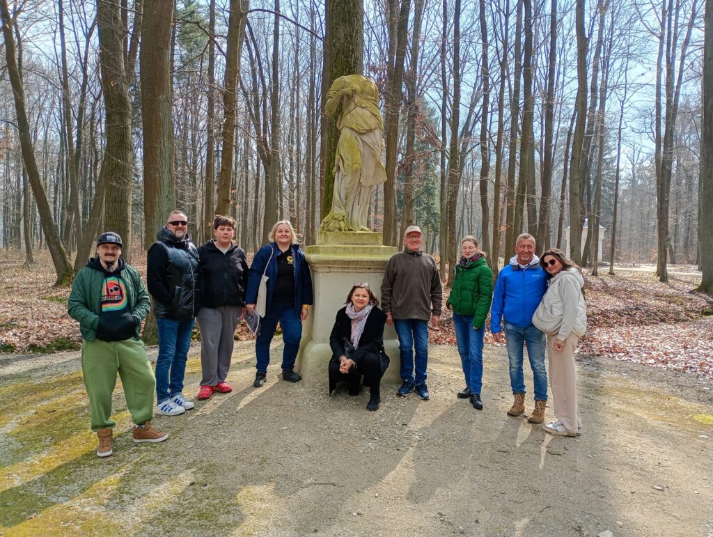 Podczas wycieczki W sPOKOJU z przyrodą nasza przewodniczka Beata Bronkowska zapoznała nas nie tylko z historią Pokoju, ale i z bogactwem krajoznawczym tamtejszego parku, swoją historią sięgającego połowy XVIII wieku. Naszą wędrówkę rozpoczęliśmy nieopodal okazałego ronda, na którym niegdyś znajdował się pałac, stanowiący rezydencję władającego okolicą rodu Wirtembergów.