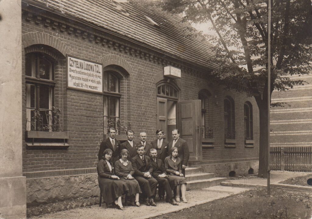 Członkowie Towarzystwa Czytelni Ludowych w Szarleju (obecnie dzielnica Piekar Śląskich) przed siedzibą biblioteki (Śląska Biblioteka Cyfrowa).